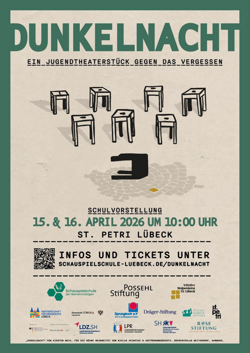 Dunkelnacht ist ein Theaterstück von Jugendlichen für Jugendliche über die „Penzberger Mordnacht“ 1945, Zivilcourage und die Gefahr des Wegschauens. 8 Jugendliche bringen den vielfach ausgezeichneten Roman von Kirsten Boie in der St. Petri Kirche Lübeck auf die Bühne. Die Inszenierung greift historische Ereignisse der letzten Kriegstage auf und zeigt, wie Menschen in eine Spirale aus Propaganda, Gruppenzwang und Loyalitätsdruck geraten. Das Stück beleuchtet die Frage nach Verantwortung und Handlungsfähigkeit in Extremsituationen – unmittelbar und altersnah erzählt.